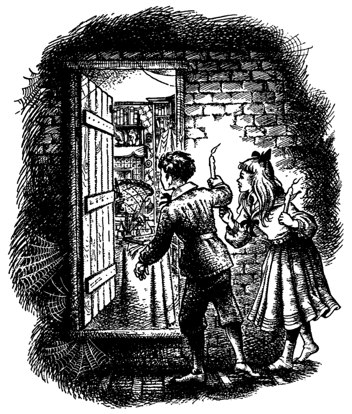 Ради такого случая каждый взял по свече (у Полли в тайнике их было много). Проход был пыльным, и тёмным, и холодным. Полли и Дигори ступали с балки на балку молча, только иногда шептали «теперь твой чердак» или «наш дом мы почти прошли». Они ни разу не споткнулись, свечи у них не погасли, и дверцы в кирпичной стене они достигли, только на ней, конечно, не было ручки, потому что никто не входил в неё снаружи, однако внутри ручка была, а снаружи торчал шпенёк (такой бывает внутри шкафа).
