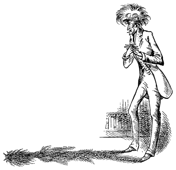Полли и не думала, что от взрослых можно такое ожидать, по-этому ужасно испугалась, и они с Дигори попятились к дверце, в которую вошли, но дядя обогнал их и запер её, а вдобавок встал перед нею, потом потёр руки, так что пальцы затрещали (пальцы у него были длинные и белые), и усмехнулся: