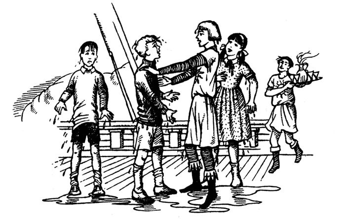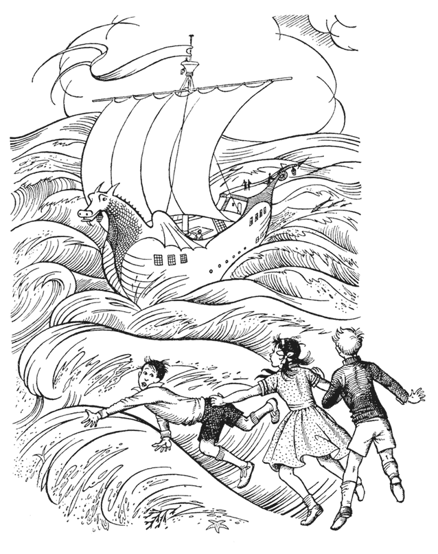 Люси и Эдмунд привыкли к приключениям, но и они могли только, как Юстас, воскликнуть «о-о!», потому что из рамы на них выплеснулась большая холодная солёная волна и окатила с головы до ног.