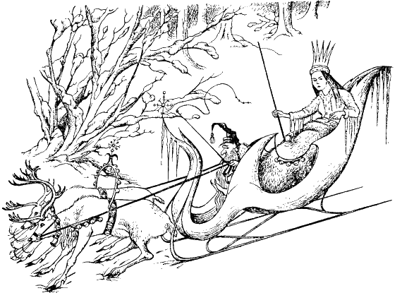 «Девчонка остается девчонкой, – сказал себе Эдмунд. – Дуется на меня и не желает слушать извинений». Он ещё раз огляделся, и ему совсем тут не понравилось. Он уже почти решил возвращаться домой, как вдруг услышал далёкий перезвон бубенчиков. Он прислушался. Перезвон становился всё громче и громче, и вот на поляну выбежали два северных оленя, запряжённых в сани.