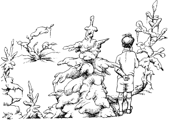 Под его ногами поскрипывал сухой снег, снег лежал на еловых лапах. Над головой у него было светло-голубое небо – такое небо бывает на заре ясного зимнего дня. Прямо перед ним между стволами деревьев, красное и огромное, вставало солнце. Было тихо-тихо, словно он – единственное здесь живое существо. На деревьях не видно было ни птиц, ни белок, во все стороны, насколько доставал глаз, уходил тёмный лес. Эдмунда стала бить дрожь.