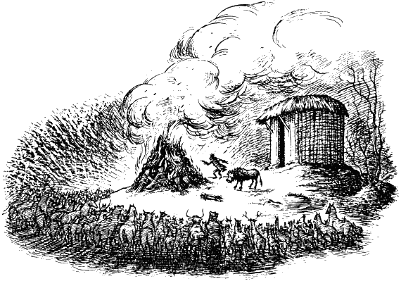 Вдалеке зажёгся красноватый свет. Потом на мгновение исчез и вновь появился, больше и ярче. Король увидел тёмные силуэты, они сновали туда-сюда, что-то приносили и сбрасывали на землю. Он догадался, что там разожгли костёр и бросают в него вязанки дров. Он ясно видел хлев, освещённый красным заревом, толпу людей и зверей между ним и огнём и ссутулившуюся фигуру позади. Это, наверное, был Обезьян. Он что-то говорил толпе, но Тириан не мог разобрать слов. Обезьян трижды склонился до земли перед дверью хлева, потом поднялся и открыл дверь. Что-то на четырёх ногах скованно и неуклюже вышло из хлева и стало лицом к толпе.