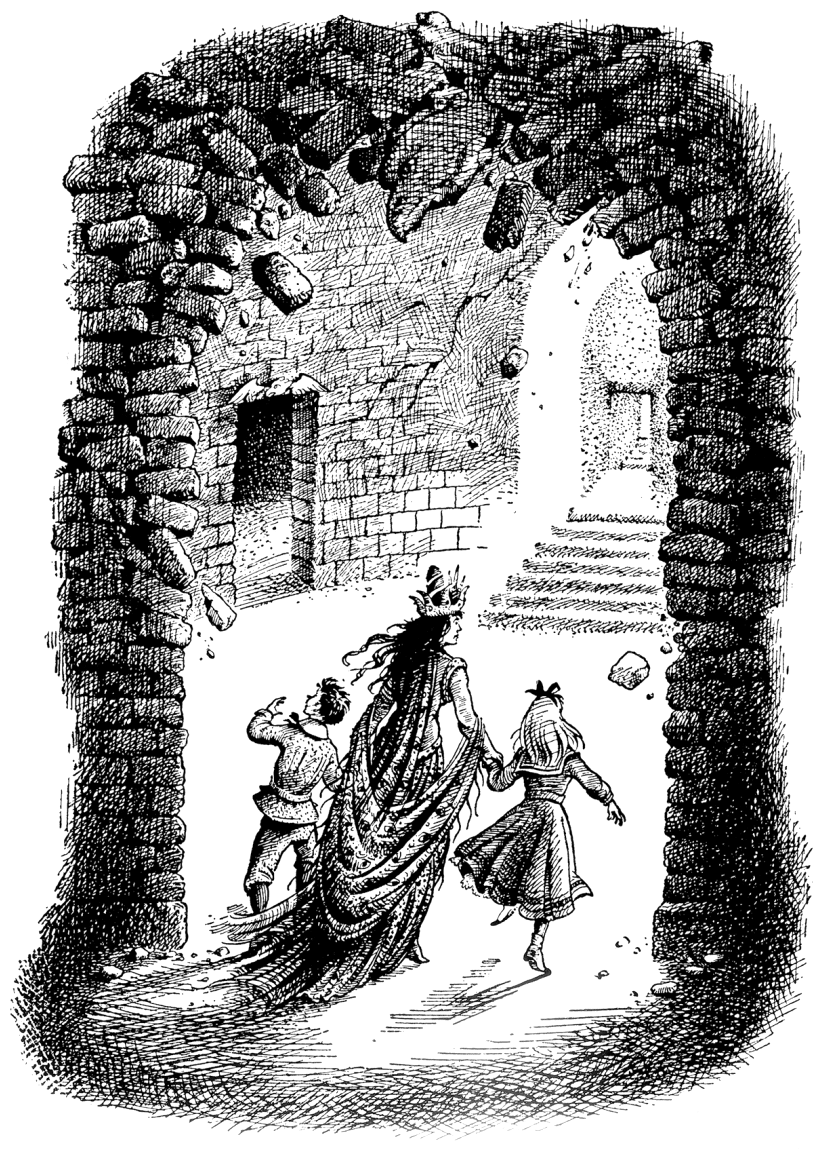Королева повела их в длинный проход, а оттуда – в настоящий лабиринт залов, лестниц и двориков. Где-то рушились куски потолка или стен, и одна арка упала сразу после того, как они под ней прошли. Приходилось бежать рысцой, хотя сама королева лишь крупно шагала в полнейшем спокойствии. «Какая она смелая! – думал Дигори. – И сильная какая. Поистине королева! Надеюсь, она расскажет, где мы».