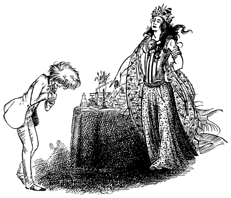 – Где чародей? – крикнула королева. – Отвечай, шут!