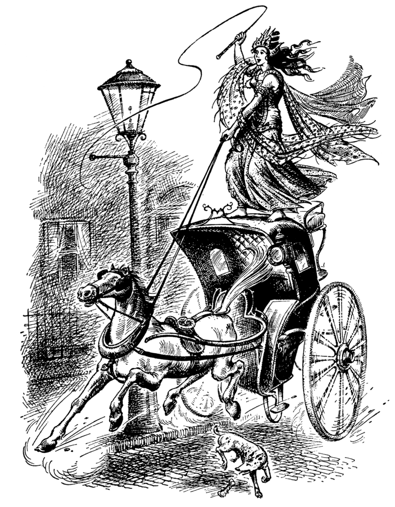 Действительно, к дому нёсся кеб. На нём – не там, где сидит кучер, а прямо на крыше – стояла Джадис, царица цариц и ужас Чарна. Глаза её горели, зубы сверкали, волосы хвостом кометы стлались за нею. Лошадь она хлестала без милости, и та, раздувая ноздри, неслась во весь опор. Пролетев в дюйме от фонарного столба, лошадь эта остановилась, встала на дыбы, а кеб стукнулся о столб и развалился на куски. Колдунья ловко перескочила лошади на спину, шепнула ей что-то, та снова встала на дыбы и заржала, как от боли. Дигори видел лишь оскал, да горящий взгляд, да гриву. Королева и тут удержалась, как самый заправский наездник.