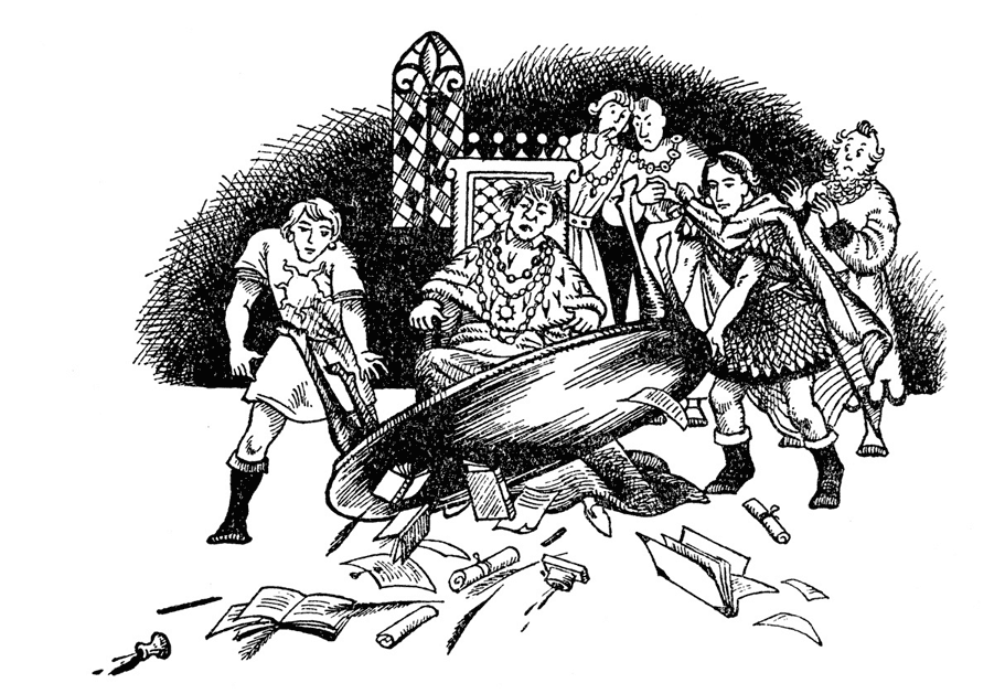 Сначала Каспиана приветствовали только те, кого предупредил посланец Берна: кто знал, что произошло, и радовался этому, – но затем к ним присоединились все ребятишки – им просто нравилась процессия, да и видеть таких не доводилось. Не остались в стороне и школьники, и не только потому, что им тоже нравилась процессия: они понимали, что чем больше шума и суматохи, тем меньше вероятность, что придётся сидеть этим утром на уроках. Следом высунулись из дверей и окон старухи и принялись переговариваться, радуясь появлению короля, – ведь что такое губернатор по сравнению с его величеством? По той же причине присоединились к толпе молодые женщины и девушки. Не последнюю роль сыграло и то, что Каспиан и Дриниан, да и все остальные, были хороши собой. Их примеру последовали и молодые люди: подошли поближе, чтобы посмотреть, на кого это они любуются. Таким образом, к тому моменту, когда Каспиан дошёл до ворот замка, приветствовать его собрались почти все горожане. Сидевший в замке Гумп, с трудом разбираясь со счетами, бланками, приказами и уставами, вдруг услышал шум.