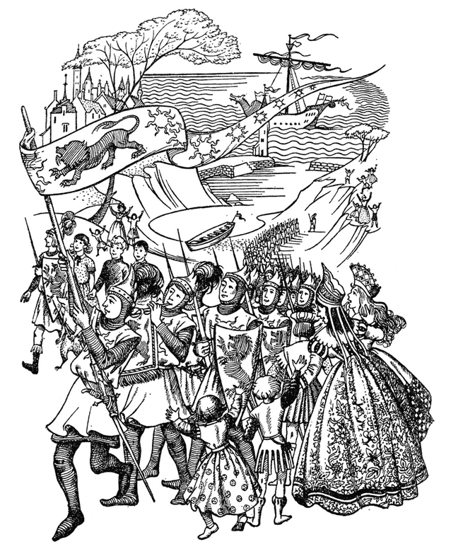 – Идите прямо по этому проливу, капитан, затем поверните к Авре: там находится моё имение, – но сначала поднимите королевский штандарт, выставьте все ваши щиты и пошлите на палубу столько народу, сколько сможете. И, когда окажетесь на расстоянии пяти полётов стрелы, подайте с левого борта несколько сигналов.