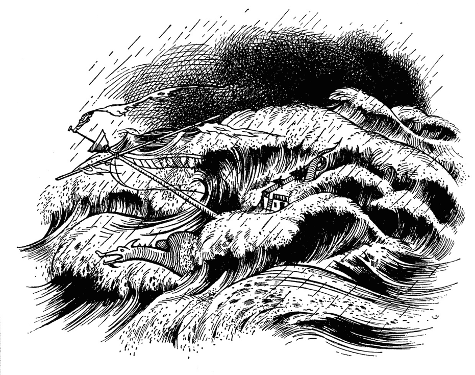 Тут же на судне начался настоящий тарарам: задраивали люки, гасили огонь в печи на камбузе, матросы лезли наверх взять риф. Не успели они закончить, как налетел шторм. Люси казалось, что перед самым носом корабля разверзлась какая-то огромная водяная впадина и они плывут прямо туда, в самую глубину. Высокая серая масса воды, поднявшаяся гораздо выше мачты, неслась им навстречу, и казалось, что их ждёт верная смерть, но судно вынесло на самый верх волны и закружило на месте. На палубу хлынул поток, полубак и полуют были словно два островка в свирепом море. Наверху матросы перемещались по реям, пытаясь справиться с парусом. Лопнувший канат, прямой, как палка, относило ветром в сторону.