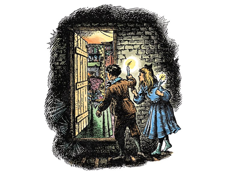 Ради такого случая каждый взял по свече (у Полли в тайнике их было много). Проход был пыльным, и тёмным, и холодным. Полли и Дигори ступали с балки на балку молча, только иногда шептали «теперь твой чердак» или «наш дом мы почти прошли». Они ни разу не споткнулись, свечи у них не погасли, и дверцы в кирпичной стене они достигли, только на ней, конечно, не было ручки, потому что никто не входил в неё снаружи, однако внутри ручка была, а снаружи торчал шпенёк (такой бывает внутри шкафа).