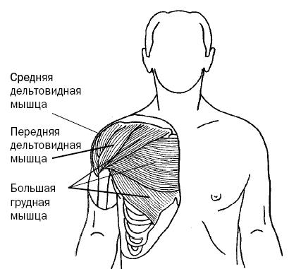 Дельтовидные мышцы прикрепляются к ключице, ости лопатки и акромиону, костной точке плеча. Их нижней точкой прикрепления является дельтовидная бугристость, небольшая шишка примерно на полпути вниз по внешней стороне плечевой кости. Функция дельтовидных мышц совместно с надостной мышцей заключается в подъеме руки в любом направлении – вперед, назад и в сторону. Задняя порция дельтовидной мышцы является сильным разгибателем руки, поскольку она поднимает руку назад.
