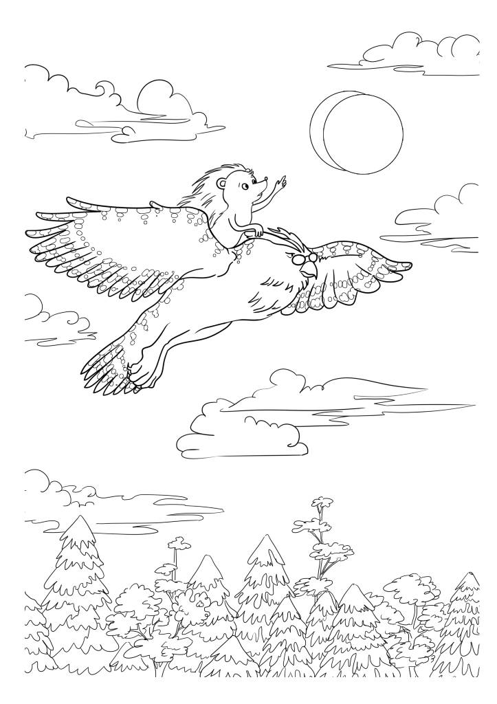 – Быстрее, Филин, быстрее, – торопил Ёжик, взбираясь тому на спину и крепко хватаясь всеми четырьмя лапками. – Полетели.