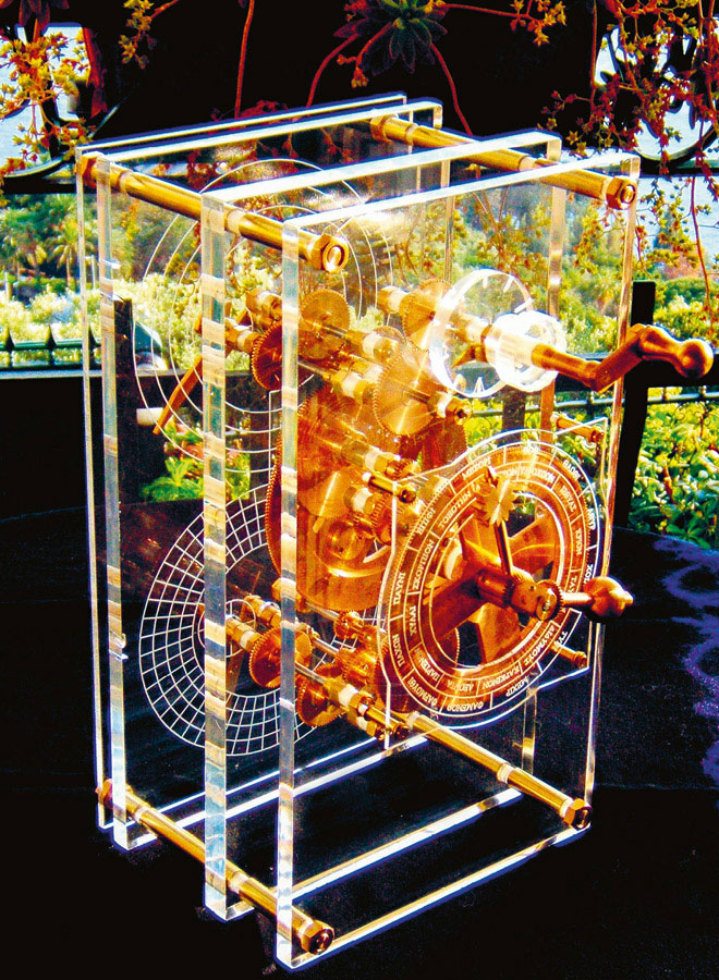 В лунном механизме использовалась особая система бронзовых шестеренок, две из которых соединялись со слегка смещенной осью для определения положения и фазы Луны. Как мы знаем сегодня из законов движения планет Кеплера, Луна, вращаясь вокруг Земли, движется с разной скоростью (чем ближе к Земле, тем быстрее). Антикитерский механизм воспроизводил эту разницу – хотя древние греки не знали о том, что лунная орбита имеет форму эллипса. Марчант пишет: «Поворачивая ручку на коробке, можно было заставить время двигаться вперед или назад, чтобы увидеть состояние космоса сегодня, завтра, в прошлый вторник или через сто лет. Тот, кто владел этим устройством, должно быть, чувствовал себя властелином небес».