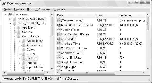 В левой части данного окна приводится перечень разделов реестра (на рис. 1.1 раскрыт раздел реестра HKEY_CURRENT_USER), в правой части отображаются параметры и их значения. Главное меню окна Редактора реестра включает в себя пункты Файл, Правка, Вид, Избранное и Справка. Кратко остановимся на каждом из них.
