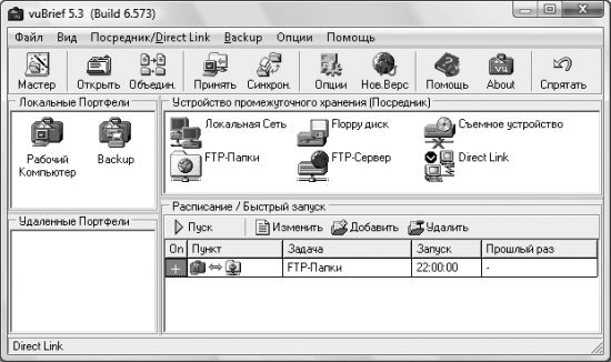 ○ Локальные Портфели. Здесь перечислены типы задач, которые может выполнять программа (либо синхронизация с рабочим/домашним компьютером, либо архивирование). Если вы уже создали какую-либо задачу синхронизации при помощи мастера, рассмотренного ранее в этой книге, то дважды щелкните кнопкой мыши на значке Рабочий компьютер, и перед вами отобразится список всех созданных задач.
