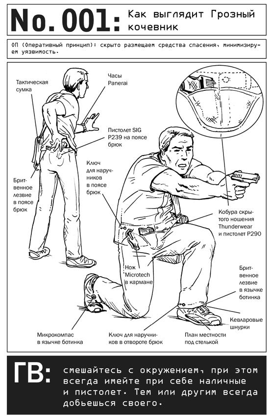 Обыватель думает о подготовке к чрезвычайной ситуации главным образом в аспекте жизнеобеспечения: он заботится, прежде всего, о запасе еды и воды (упрятанном глубоко в погребе), а не об оружии и маршрутах отхода. Между тем настоящая готовность – это осознание опасностей современного мира и умение противостоять им. Чтобы пребывать в постоянной готовности, Грозный кочевник имеет при себе до трех видов носимого аварийного запаса (НАЗ), каждый из которых помогает выполнить задание и избежать критических ситуаций. Будет случай или нет, но этот набор также дает агенту преимущество в случае любых неожиданных угроз, от стихийных бедствий до террористических актов и нападения преступника-одиночки. На потенциально опасной территории и в моменты политической нестабильности Кочевник несет на себе несколько слоев скрытого в одежде и вещах снаряжения для жизнеобеспечения и самозащиты: в случае, если его схватят и разоружат, он имеет шанс сохранить при себе несколько не замеченных противником инструментов на самый крайний случай. Средства спасения нужно располагать так, чтобы какие-то из них оставались доступными, даже если ты связан.