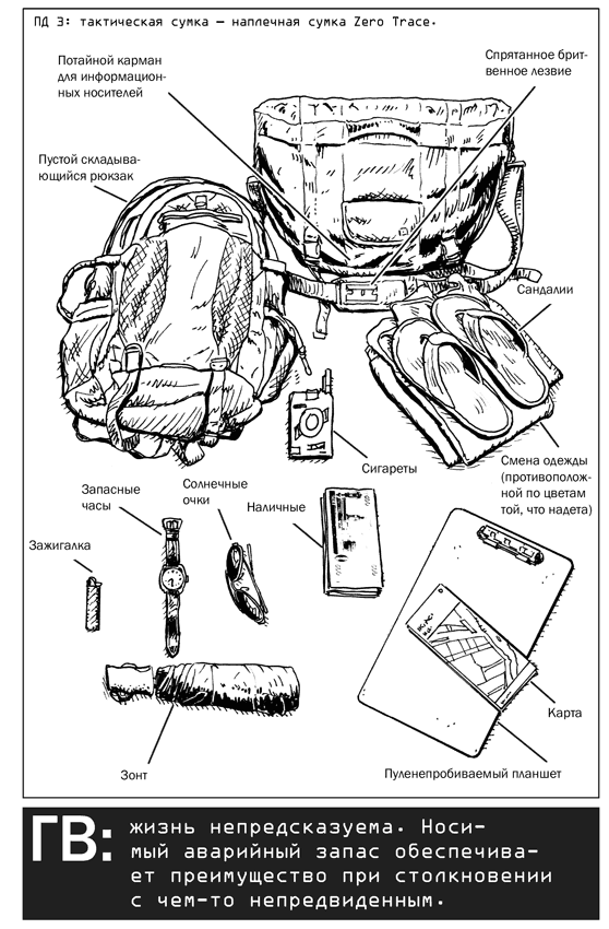 Последний из трех вариантов – тактическая сумка. Чтобы быть готовым к возможной эвакуации и отходу в случае слежки или при попытке захвата, агент должен иметь в тактической сумке складывающийся рюкзак и комплект одежды, по цвету противоположный тому, который он носит. Следует обдумать даже обувь – если ходишь в кроссовках, упакуй пару резиновых сандалий. В потайном кармане сумки хранятся строго секретные данные на запоминающих устройствах типа флеш-накопителя или SD-карты; кевларовый планшет для бумаг не вызывает подозрений, но может послужить щитом от пуль, а пачка купюр поможет Кочевнику «не светиться», сколько того потребует ситуация.