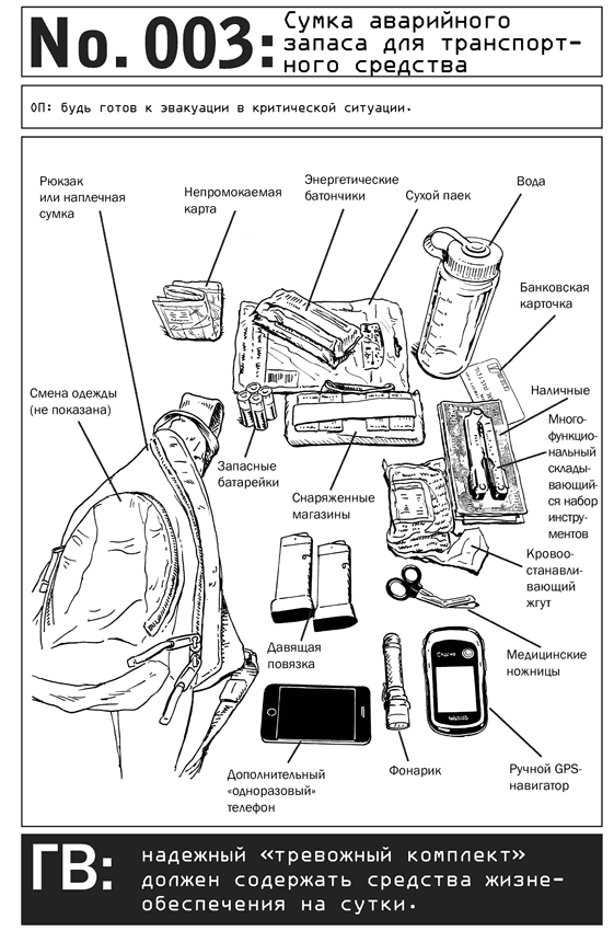 Дополнительное оборудование и сопутствующие навыки (см. далее): собираем сумку аварийного запаса для транспортного средства; срочная маскировка; использование пулеотражающего щита; выбор укрытия.