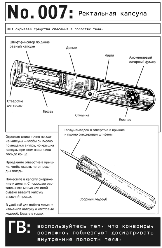 Если агента схватили, его, вероятно, обыщут на предмет спрятанного оружия, и большая часть скрытого снаряжения перейдет в руки врага. Средства спасения, размещенные в одежде, могут остаться до поры не замеченными, но агенты знают: в плену тебя рано или поздно разденут донага, и тогда можно будет полагаться лишь на снаряжение, спрятанное непосредственно на теле или в теле. Поскольку на помощь из центра рассчитывать не приходится, планируя операцию, любой агент уделяет особое внимание подготовке к побегу из плена.
