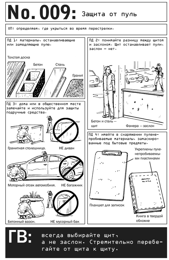 В чрезвычайной ситуации нужно уметь классифицировать объекты, окружающие нас в быту. Гранитные столешницы, бетонные вазоны и стальные бытовые приборы дают защиту. Прилавки, письменные столы и столы в гостиничных номерах часто делаются из гранита или стали. Другие бытовые объекты могут казаться прочными, на деле же выполнены из легких материалов, не защищающих от пуль. Почтовые ящики и мусорные баки обычно делают из алюминия. Громоздкие игровые автоматы – это, по большей части, стекло и пластмасса. В автомобилях используется сталь, но очень тонкая, поэтому при отсутствии других вариантов укрывайтесь, по крайней мере, за той частью машины, где расположен двигатель, а не за полым багажником: так между вами и стрелком окажется дополнительная преграда из плотных материалов.