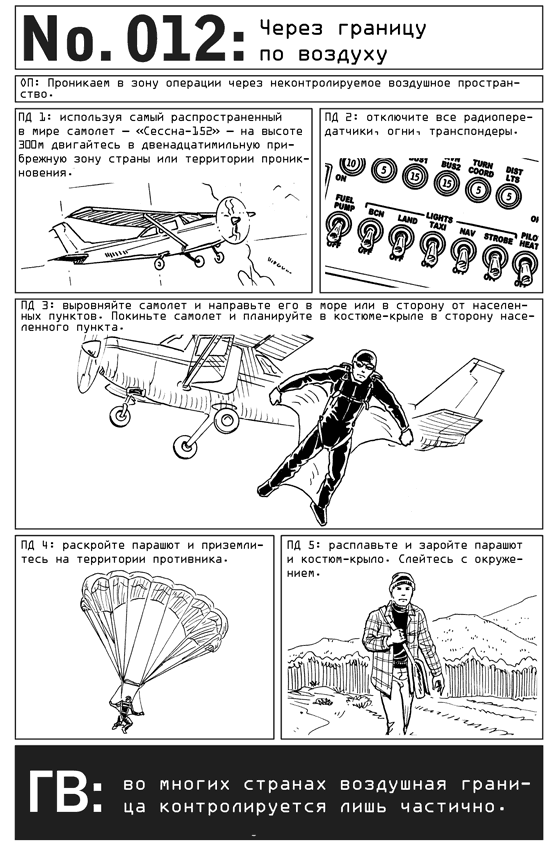 У обывателя незаконный переход границы зачастую ассоциируется с глубокими подземными ходами, проводниками, которым надо заплатить за то, чтобы показали тайную тропу, и переброской в фургоне к захолустному полустанку. Но спецагент проникает на территорию другого государства без посторонней помощи – лучше всего там, где граница охраняется наименее строго. Ее можно пересечь по морю, по суше или по воздуху, и если выбрать безлюдный участок, в ночной час это можно сделать, оставшись незамеченным. Для опытного агента проникновение по воздуху – двухходовая задача: во-первых, надо угнать оставленный без присмотра частный самолет (см. далее), а во-вторых, десантироваться с помощью костюма-крыла и парашюта.