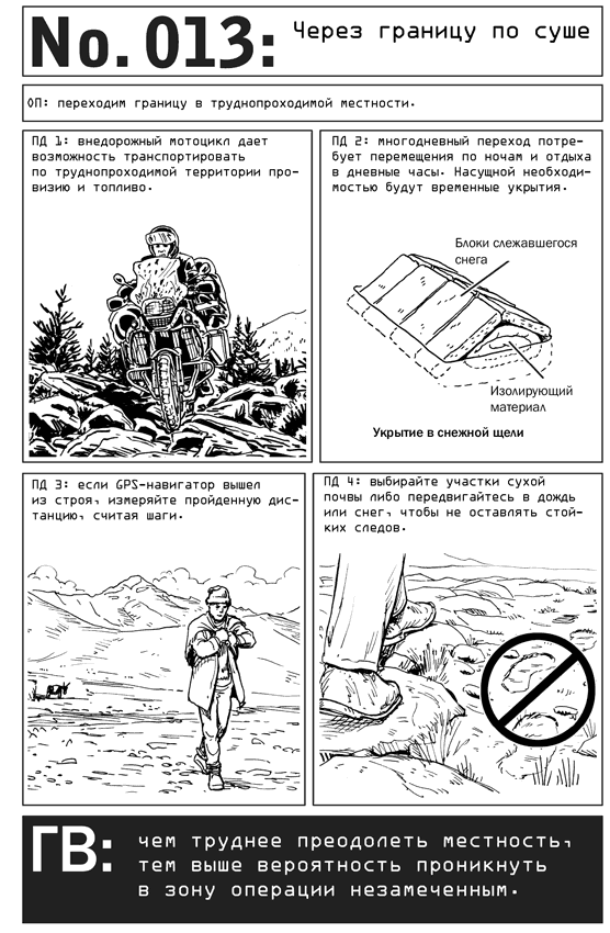 Ориентирование: когда характер местности вынуждает агента двигаться пешком, начинается самый изнурительный этап проникновения. Чтобы достичь цели, приходится иногда идти несколько дней кряду в самую неблагоприятную погоду. (Строго говоря, плохая погода – оптимальный вариант для уничтожения отпечатков подошв.) Поэтому Кочевнику нужно уметь ориентироваться только по компасу и карте, на случай, если откажет GPS-навигатор.