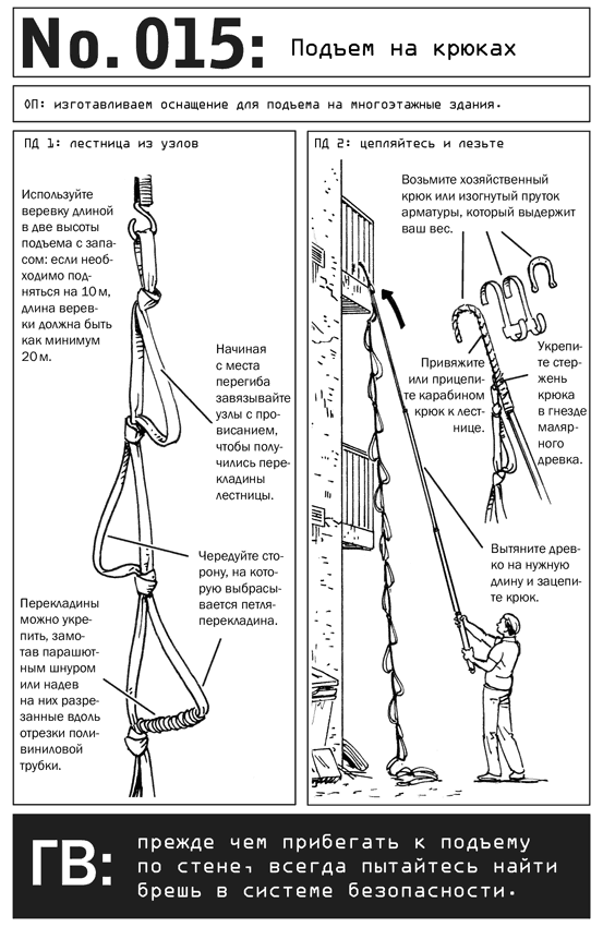 К счастью, любое строение с балконами на задней стене дает возможность подняться, цепляясь за них. Взяв малярное древко, длинный кусок трубчатого нейлона или веревки и крюк, агент может изготовить легкую перекидную лестницу, которая выдержит его вес и позволит воспользоваться простой техникой «подъема на крюках», которую веками применяли пираты, чтобы попасть на чужой корабль.