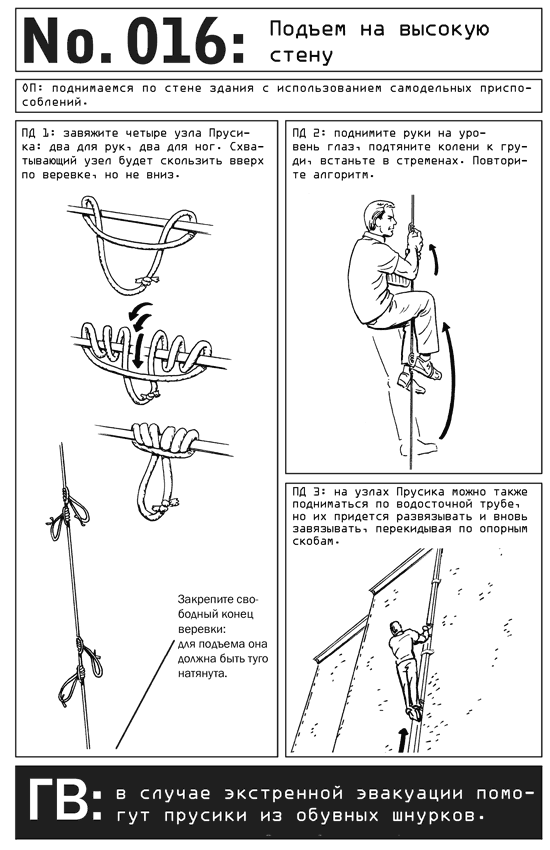 При подъеме по веревке лучше всего изготовить четыре таких стремени: для опоры ног и рук. В случае нехватки материалов (например, агент использует шнурки в ситуации срочной эвакуации) хватит и двух петель – одной для рук, другой для ног.