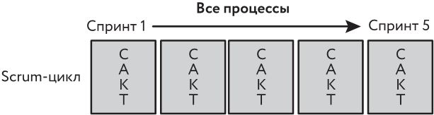 Внутри спринта процесс не последовательный (С, затем A, затем К, затем T). Преобладающая идея – идея непрерывного потока, прерванного только в конце спринта.