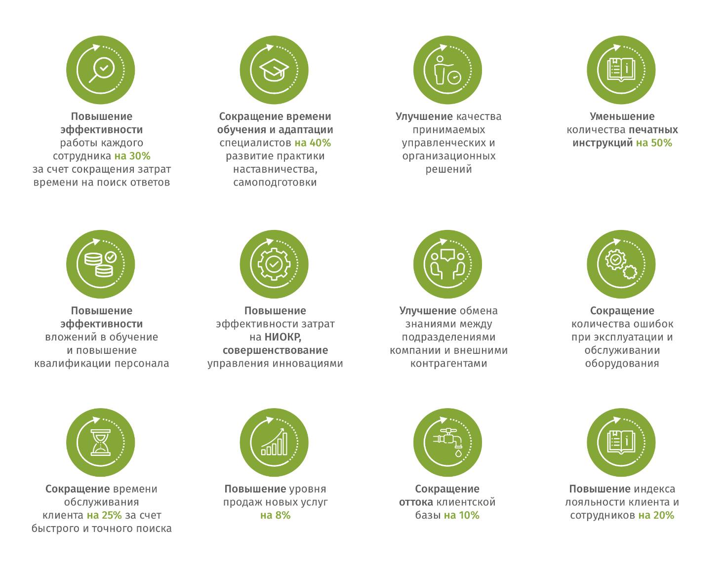 Альтернативой является развитие корпоративной функции управления знаниями в совокупности с внедрением современных технологий управления знаниями, что позволяет организации получить актуализированную стратегию развития, стандартизировать процессы, унифицировать подходы, системно описать методологию и ролевые модели и, самое главное, – получить единый источник знаний для всех пользователей. Анализ сложившейся мировой практики внедрения СУЗ позволяет говорить о возможности добиться следующих практических результатов (Рис. 2).
