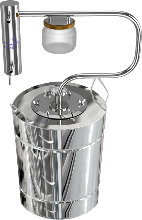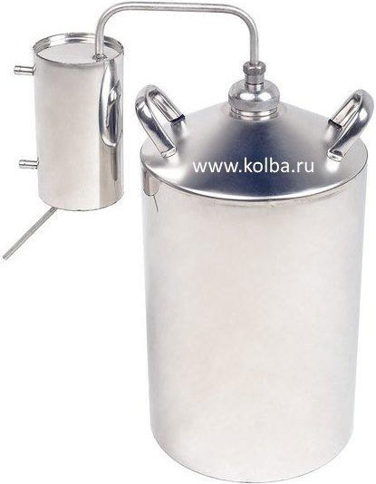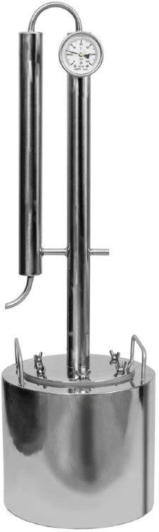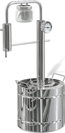 Простейший дистиллятор (Рис. 7) состоит только из перегонного куба и охладителя (холодильника). Некоторые модели в своей комплектации не имеют даже термометров. Такие дистилляторы покупают либо в подарок, так как они самые дешёвые в данном сегменте, либо для себя, если нужен самогон без лишних затрат на оборудование. Плюсы: цена. Минусы: низкая степень очистки алкоголя от вредных примесей.