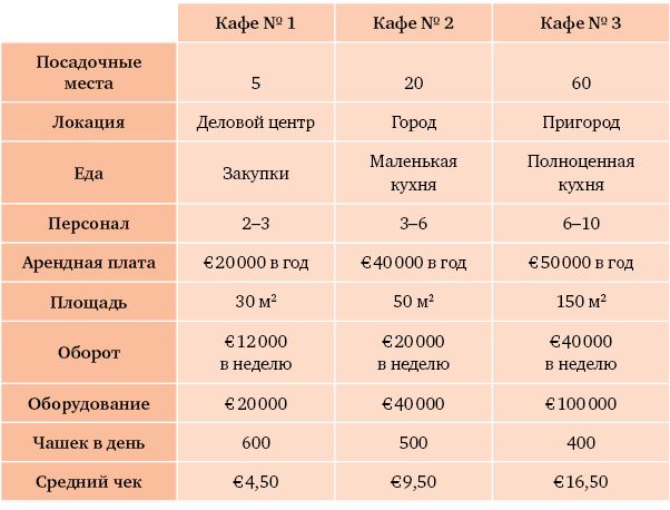 Эти три варианта – эспрессо-бар, маленькое кафе и большая кофейня. Я знал, что любой из них мне по плечу, но определил их специфику и набросал для каждого отдельный бизнес-план – это помогло мне разложить все по полочкам.
