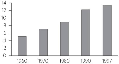 В 1997 г. расходы на здравоохранение в США превысили 1 трлн долл.{28} Как мы отмечали в 2005 г., стоимость нашего «здоровья» увеличивается такими стремительными темпами, что уже не поддается контролю, и, по прогнозам Медицинской финансовой администрации США, к 2030 г. американская система здравоохранения будет обходиться гражданам в 16 трлн долл.{29} Темпы роста этих расходов настолько сильно опережают инфляцию, что один из каждых семи долларов американского ВВП тратится на здравоохранение (рис. 1.4). Менее чем за 40 лет доля указанных расходов увеличилась в ВВП почти на 300 %! Что же покупается за счет всех этих дополнительных финансовых средств? Улучшение здоровья? Я отвечу на этот вопрос отрицательно, и многие серьезные эксперты со мной согласятся.