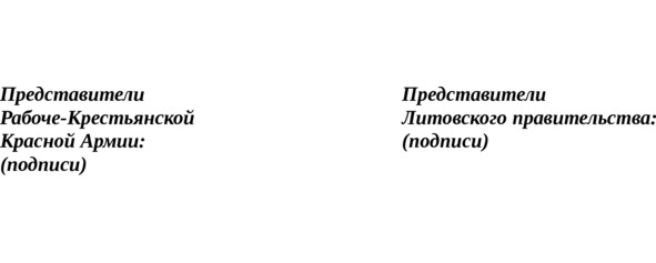 Представители Рабоче-Крестьянской Красной Армии СССР и представители Литовского правительства в целях сохранения военной тайны условливаются, что без предварительного согласования между советским и литовским военными командования ми в литовской прессе и по радио не будут разглашаться сведения о дислокации, составе, вооружении и боевой подготовке советских войск в Литве, а также и в советской прессе и по радио – о дислокации, составе, вооружении и боевой подготовке литовских войск.