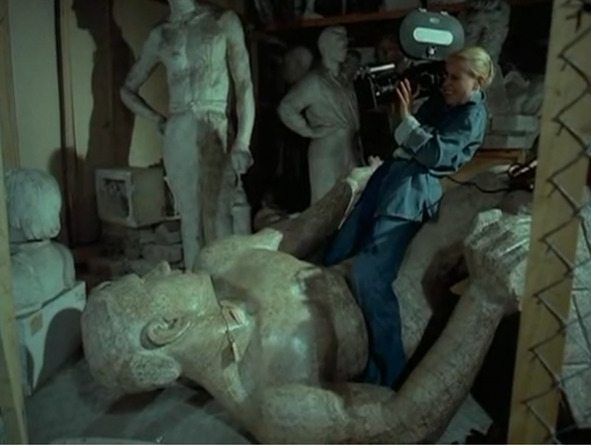 В целом же героиня с камерой и советское изваяние, на котором она восседает, образуют своего рода скульптурную группу, в которой «человек из мрамора» становится опорой и платформой для человека с киноаппаратом. Возникает единый контур, единый объем скульптуры, живого человека и технического аппарата, словно выражая идею пластической триады, сращенности этих составляющих в новое тело, а точнее организм новой эпохи, которая основывается и опирается на изучение «тела истории».