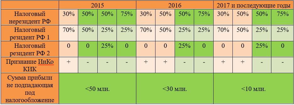Ниже представлена сравнительная таблица по различным долям владения иностранной компанией с учетом переходного периода в 2015–2016 годах.