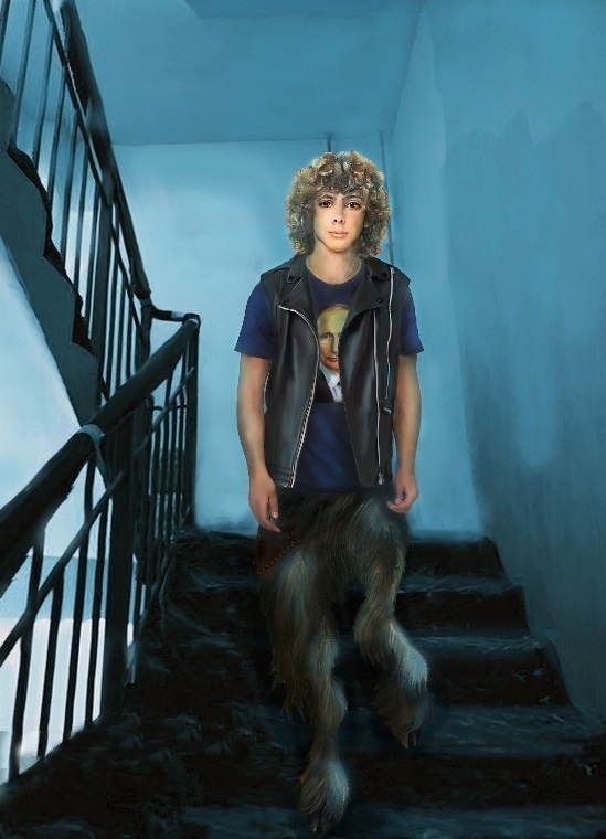 Верхняя часть существа напоминала подростка: кучерявые волосы, редкая бородка и большие, в пол-лица, доверчивые глаза. Одет достаточно современно: футболка с портретом Путина и кожаная жилетка. Однако ниже пояса подросток превращался в элемент мелкого рогатого скота. Я не эксперт в зоологии, но его ноги очень напоминали бараньи.