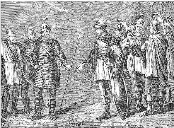 Грузно и медленно приближались персы, направляясь через Фессалию, к Фермопильскому проходу, который открывал путь в самое сердце Греции. Тут были ее самые многолюдные города, сочные пастбища, поля, покрытые оливковыми деревьями и виноградниками, здесь процветала торговля и промыслы, из здешних гаваней расходились отважные мореходы к берегам Малой Азии, Крыма, Кавказа, к дальним берегам Африки, Италии и Испании – то для торгового дела, то для поселения в новых привольных местах. На родине греков было слишком людно, тесно. Между Фессалией и Локридой, на границе этих двух греческих областей, горный хребет Эты упирается в море, оставляя небольшой проход, в самом узком месте – не более семи сажень. С одной стороны плещет в скалистый берег Эгейское море, а с другой – возвышается круто, обрывисто гора Анопея. Прежде здесь был перекоп, а спереди запруда, отчего и сам проход назывался Фермопилами, что значит по-русски «врата теплых ключей». На общем совете греческих вождей решили занять это место, но греки выставили, далеко не по условию, всего 6 тысяч тяжелой пехоты под начальством спартанского царя Леонида, собственно же спартанцев было только 300 человек. Леонид, узнавши, что персы вошли в Фессалию, возобновил древний вал, часть своего отряда поставил впереди, а тысячу фокеян выдвинул влево на гору. Там была маленькая тропинка, которая вела в тыл греческого отряда. Персы приблизились, и когда доложили Ксерксу, что проход занят, царь громко расхохотался: ничтожная кучка людей вздумала удержать его миллионы! Он отправил к Леониду послов с наказом немедленно выдать оружие. «Придите и возьмите», – сказал послам спартанский царь.