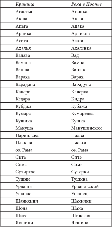 Здесь следует привести данные С. Жарниковой и А. Виноградова (см.: «Восточная Европа как прародина индоевропейцев»; http://www.cultinfo.ru): «В Волго-Окском междуречье есть множество рек, над именами которых тысячелетия оказались не властны. Для доказательства этого не требуется особых усилий: достаточно сравнить названия рек Поочья с названиями «священных криниц» Махабхараты, точнее, той ее части, которая известна как «Хождение по криницам». Именно в ней дано описание более 200 священных водоемов древнеарийской земли Бхараты в бассейнах Ганги и Ямуны (по состоянию на 3150 г. до н. э.):