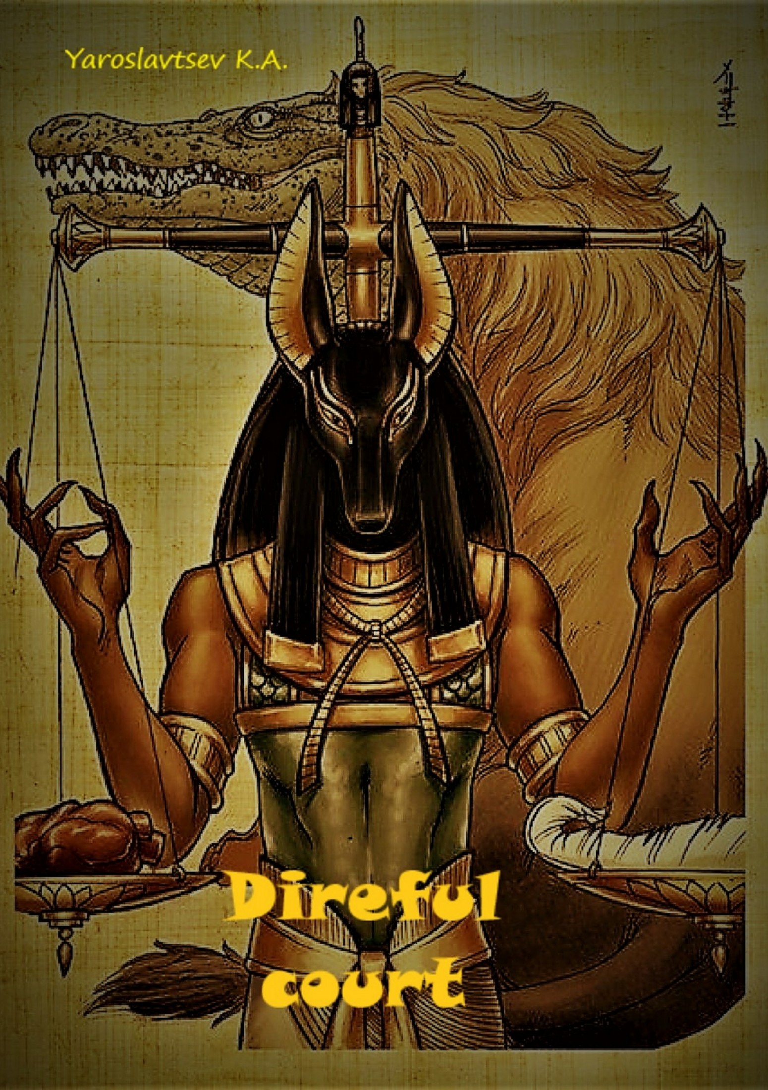 Как же я ошибался в том, что он смотрел на меня – его взгляд был направлен позади меня. Задержав дыхание, я обернулся – позади меня в паре шагов стояло существо, высотой около трёх метров. На крепкое человеческое тело, яростно вздмыющегося от дыхания существа, была насажена голова то ли шакала, то ли собаки, то ли волка. На ней виднелся огромный, спускавшийся до плеч, золотистый немес, со змеем, украшающим его верхушку. Злостный оскал украшал его серую, покрытую шерстью морду, с его рта обильно стекала вязкая жижа, звонко капающая на песчаный пол. Его остроконечные уши были слегка изогнуты, напоминая серп луны. Тканевая одежда прикрывала лишь его нижнюю часть, голый, мускулистый торс держал на себе плотный воротник, доходящий лишь до шеи. Его запястья были опоясаны золотыми браслетами, в руках он держал посох Уас и Священный Ангх. Его чёрные, глубоко посаженные глаза пристально смотрели на нас. Существо громко и тяжело дышала, из его рта вырывался белый пар. В голову просочились мысли, воспоминания о мифологии Египта – единственное, чем я мог оправдать и описать существо, подобное этому, являлся образ Анубиса. Бог мёртвых, покровитель некрополей, проводник в царство мёртвых, хентиаменти – стоит, возвышаясь в полный рост и издавая лёгкий рык, перед нашими глазами.