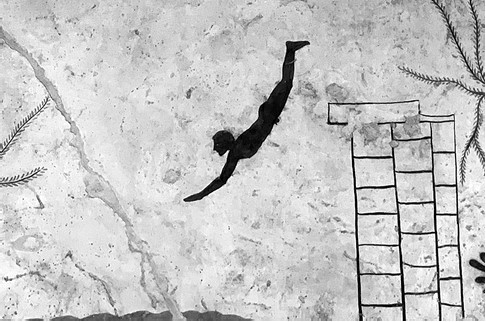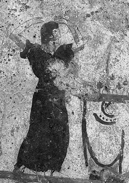 Причиной моего интереса к пластике плача послужил пост искусствоведа Николая Иванова: он снял роспись на лекифе, выставленном в Археологическом музее Пирея. Вещь датируется последней четвертью V века до н. э., найдена на острове Саламин. Изображение имеет подпись: «Плачущая» (ил. 3). Я смотрела на это изображение и думала – что-то тут не так: воздетые и закругленные над головой руки не позволяют голосить. Пластика этой плачущей противоречит той, которую мы наблюдаем у воплениц. Я стала искать изображения, которые показывают древнегреческую похоронно-поминальную традицию, и обнаружила довольно много подобных этому. К древнейшим относятся изображения, открытые в гробницах, IV–III веков до н. э. неподалеку от города Пестум. Самая известная гробница из Пестума – с так называемым ныряльщиком (ил. 3а, 4а, 5а, 6а). Гробницы были раскрашены внутри, то есть изображения были обращены к телу, внутрь. И здесь мы видим тот же повторяющийся жест с воздетыми над головой полусогнутыми в локтях руками (ил. 4, 5, 6).