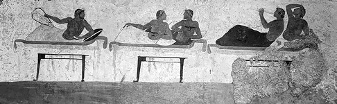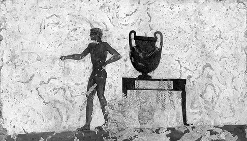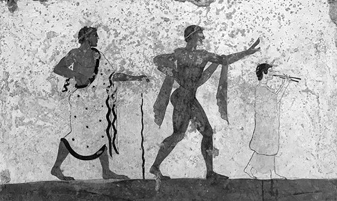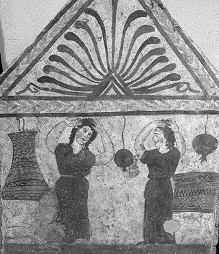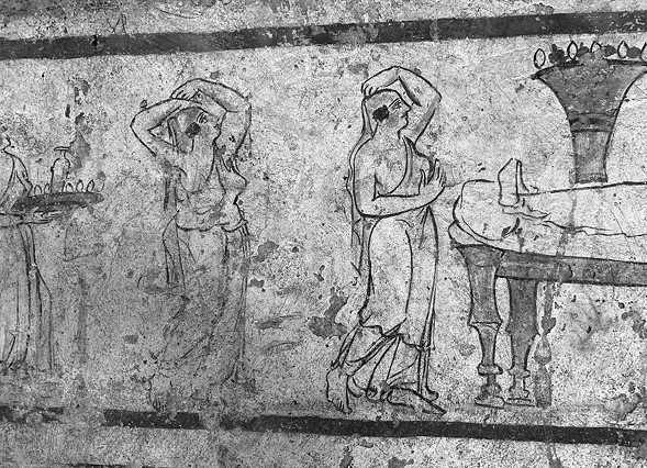 Археологические и литературные свидетельства, взятые вместе, ясно показывают, что оплакивание включало движение, а также плач и пение. Поскольку каждое движение определялось образцом ритуала, часто сопровождаемого пронзительной музыкой аулуса (свирели), сцена должна была напоминать танец, иногда медленный и торжественный, иногда дикий и экстатический[101].