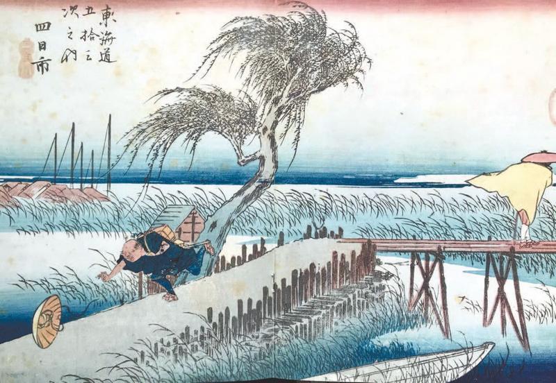 Мы сказали, что два настроения близко соседствуют в этой картине. Но нет, это неверно. Потому это неверно, что, уловив настроение элегическое и то, которое комическое, и когда, пропитавшись ими – такими тебе понятными и близкими! – и все думая и думая о прекрасной душе и чудесном таланте Андо Хиросиге, мы переводим свой взгляд с того, что изобразил художник на переднем и близком планах своей картины, мы смотрим туда, где виднеются крыши низеньких хижин, крытых пожухлым камышом. Да, как же без этих хижин можно здесь: ведь у этой картины два имеется названия: «Станция Ёккаити. Порыв ветра». Но только где же эта станция-то? А нет её теперь здесь. Давно уже нет. А ведь когда-то тут шла в определённые дни оживлённая торговля! Но про те дни всё уже совсем, почти совсем! – давно позабылось. И вот через мысли/чувства про эту позабытую, навсегда ушедшую в никуда, давнюю ту жизнь – как всегда через это с нами бывает… да, в ностальгические чувствования уходим мы тогда.