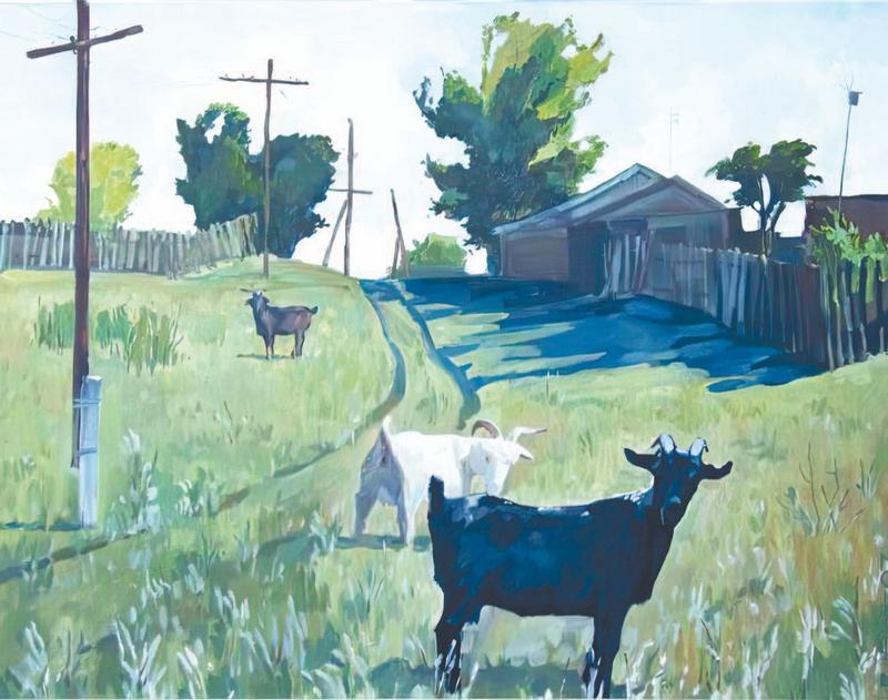 В этой деревушке одни, верно, бабки да старики остались. Да и тех-то не видать сейчас. Что видим мы живого на этом полотне, так это вот эти три козы. А ещё и хатёнки вон, сараюшки за ветхим заборчиком из старых-престарых досточек. И эту вот, спорышом заросшую, дорожную колею. Уже давно, видать, уж ни одна машина не проезжала здесь. И надо всем этим – высокие кресты столбов линии электропередачи.