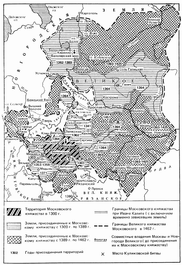 А что было вокруг? Если посмотреть на карту русских земель XII-XIII веков, то сразу бросится в глаза измельчённость княжеских владений и поневоле задашься вопросом: как такие могучие соседи, как Золотая Орда и Великое княжество Литовское позволили в северной части Средне-Русской равнины сформироваться единому русскому государству с Москвой во главе? Действительно, Литва – от моря до моря; Орда – от юга до северо-востока. А между ними малюсенькое (даже в сравнении с другими княжествами) Московское княжество. Сам город Москва располагался в границах современных Кремля и Китай-города, в нём в первой четверти 14 века ни одного каменного сооружения.