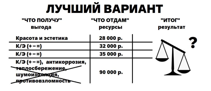 – Тренер: Да. Происходит оценка уже четырёх тысяч. Такова разница в цене от самого простого первого варианта. Готов ли он доплатить их, чтобы не переживать? Вдруг самая дешёвая дверь облезет или развалится…