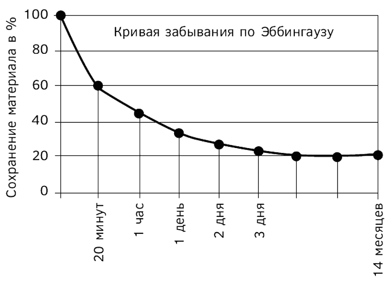 Итак, Эббингауз для исследования чистой памяти стремился заучить лишенные смысла слоги, которые не несут никакой смысловой нагрузки и не похожи ни на какое слово. К примеру, это могут быть такие слоги: «рон», «цед», «пеф», «щем», «дин», «нар» или другие такого же рода. В процессе экспериментов, которые Эббингауз проводил над собой (и не только), ему удалось выяснить следующее: ряды подобных слогов забываются за короткий промежуток времени, то есть очень быстро. Примерно за час забывается уже около 60 % того, что человек запомнил. В дальнейшим же интенсивность забывания ослабевает.