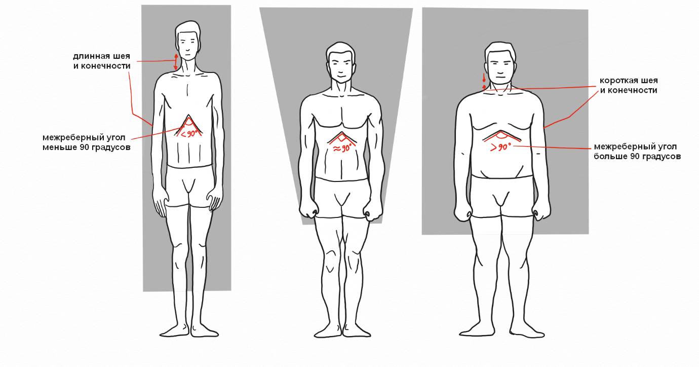 Мезоморф – предпочитает движение и действие, больше получает удовольствия от взаимодействия в активности и эмоциях. Телосложение атлетическое, межреберный угол равен 90 градусов.