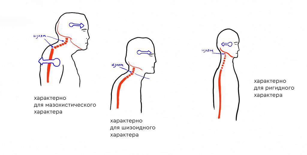 Голова бывает отделена в месте первых шейных позвонков, в середине шеи или на уровне плеч. Мои клиенты часто так и говорят: «я чувствую, что голова отделена от всего тела». И когда я спрашиваю, как и где они это чувствуют, они точно определяют границу раздела верхней и средней зон.