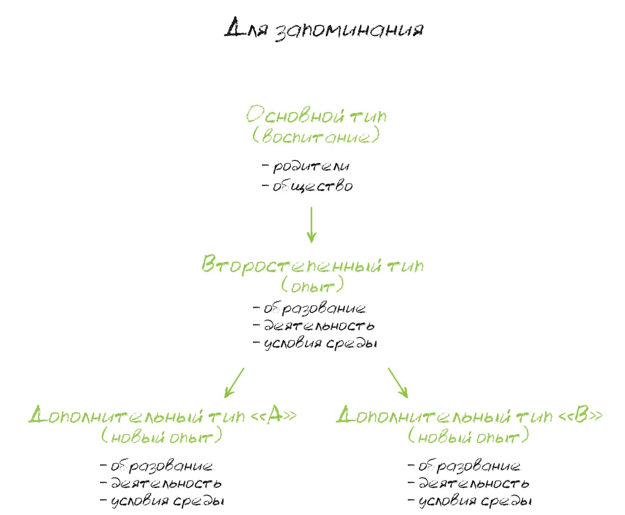У взрослого человека имеется ОСНОВНОЙ тип сознания (созданный в детстве родителями/воспитателями) и ВТОРОСТЕПЕННЫЙ (образовавшийся в период формирования личности в результате дополнительного обучения, жизненного опыта, условий среды).