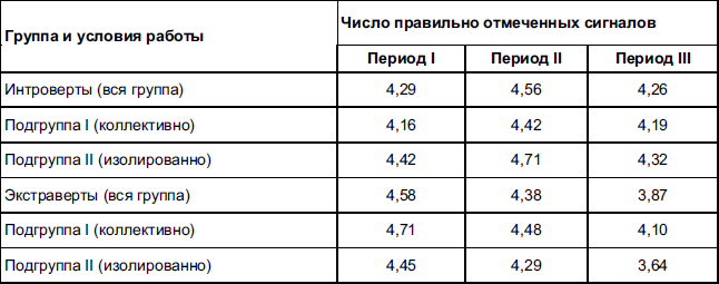 Как видно из табл. 3, интроверты превосходят экстравертов. У них заметно улучшение от первого периода ко второму и некоторое ухудшение в третьем, впрочем приводящее их примерно на уровень первого периода. У экстравертов продуктивность регрессирует постепенно от первого периода к третьему. Если принять продуктивность первого периода за 100 %, то третий период показывает по всей группе экстравертов 84 %, для подгруппы, работавшей коллективно, – 87 %, а для подгруппы, работавшей в изоляции, – 82 % (Bakan P., Belton J., Toth J. С., 1963).